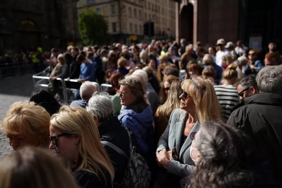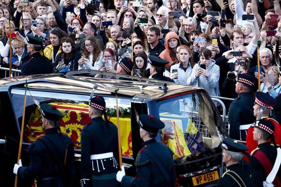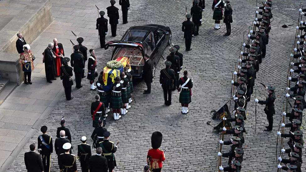 On arrival at St Giles’ Cathedral, pallbearers carried the coffin of Queen Elizabeth II, which was draped in the Royal Standard of Scotland.