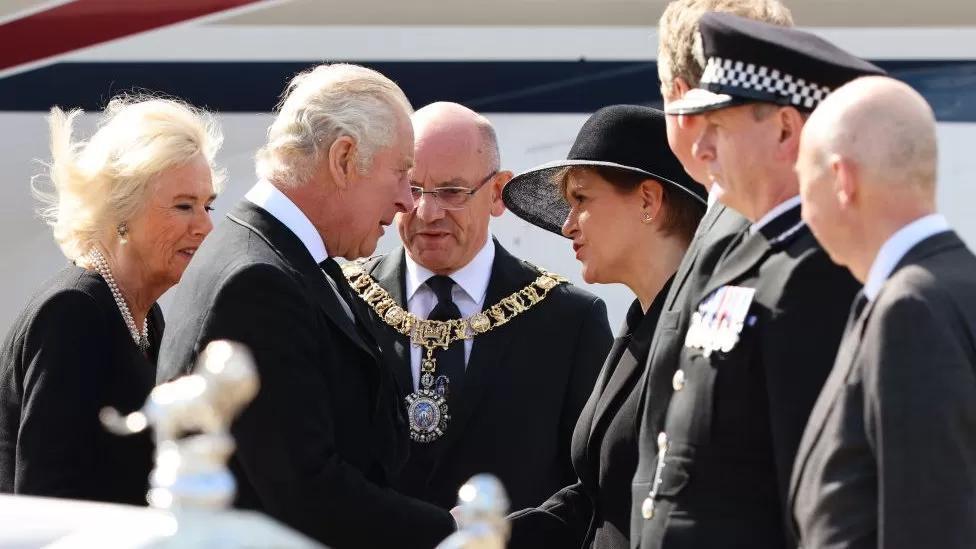 The King met Scotland’s First Minister Nicola Sturgeon at Edinburgh Airport after travelling from London with the Queen Consort.