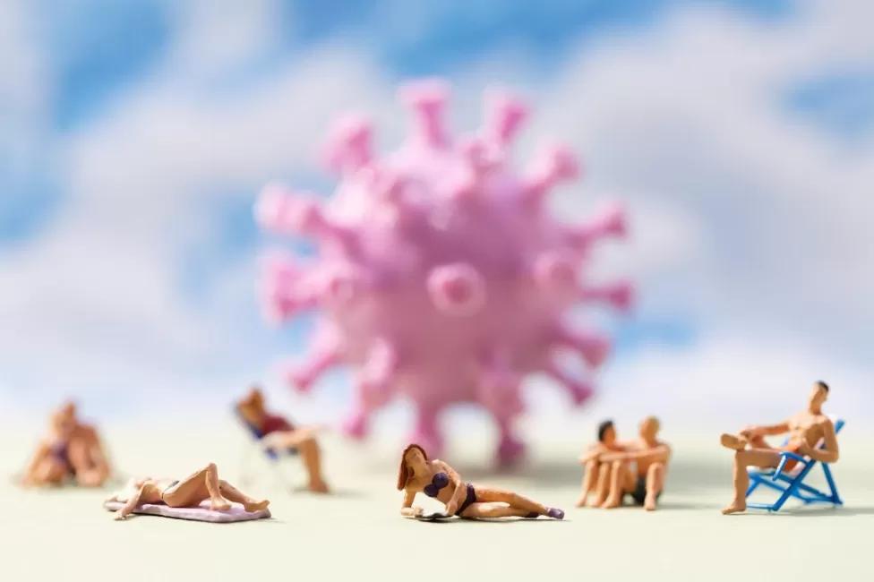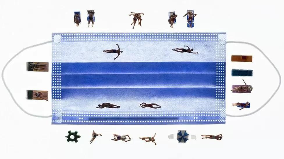 But instead David took a picture of the familiar blue face masks that were worn everywhere during Covid and reimagined it as a swimming pool with tiny figurines enjoying vacation activities around it.