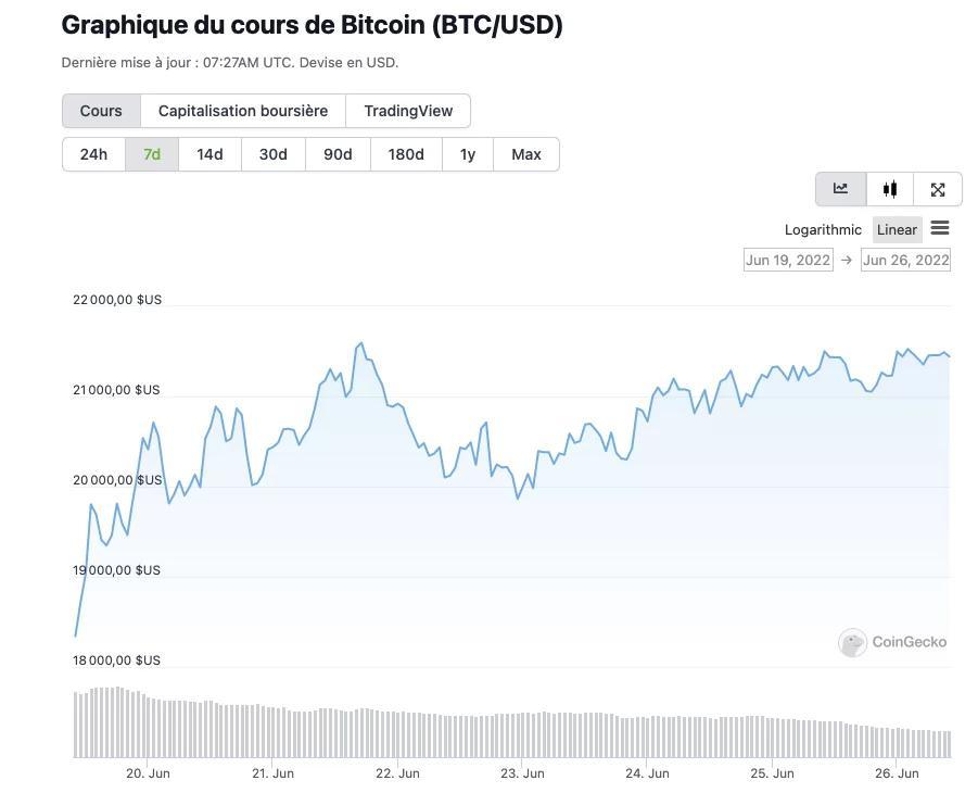 La valeur de la crypto-monnaie phare est en tête du marché cryptographique mondial en termes d’afflux. Actuellement, le bitcoin (BTC), l’actif numérique ayant la plus forte capitalisation boursière, se négocie à 21 392 $, en hausse de 2,29 % au cours des dernières 24 heures et de 10,27 % au cours de la semaine précédente.