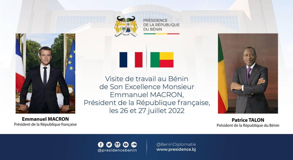 Africa-Press – Benin. Le président français Emmanuel Macron déroule depuis quelques minutes son agenda au Bénin. Arrivé dans la nuit du mardi 26 juillet 2022, il est actuellement au Palais de la Marina et tient comme l’indique son chronogramme, un entretien avec le président béninois Patrice Talon.