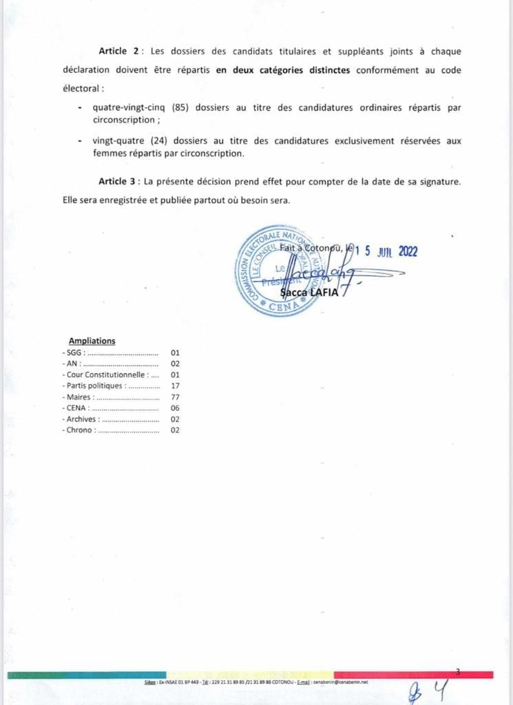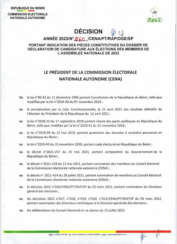 Par une décision en date du vendredi 15 Juillet 2022, la commission électorale nationale autonome (CENA) a rendu public les pièces constitutives du dossier de déclaration de candidature aux élections des membres de l’assemblée nationale, neuvième législature.