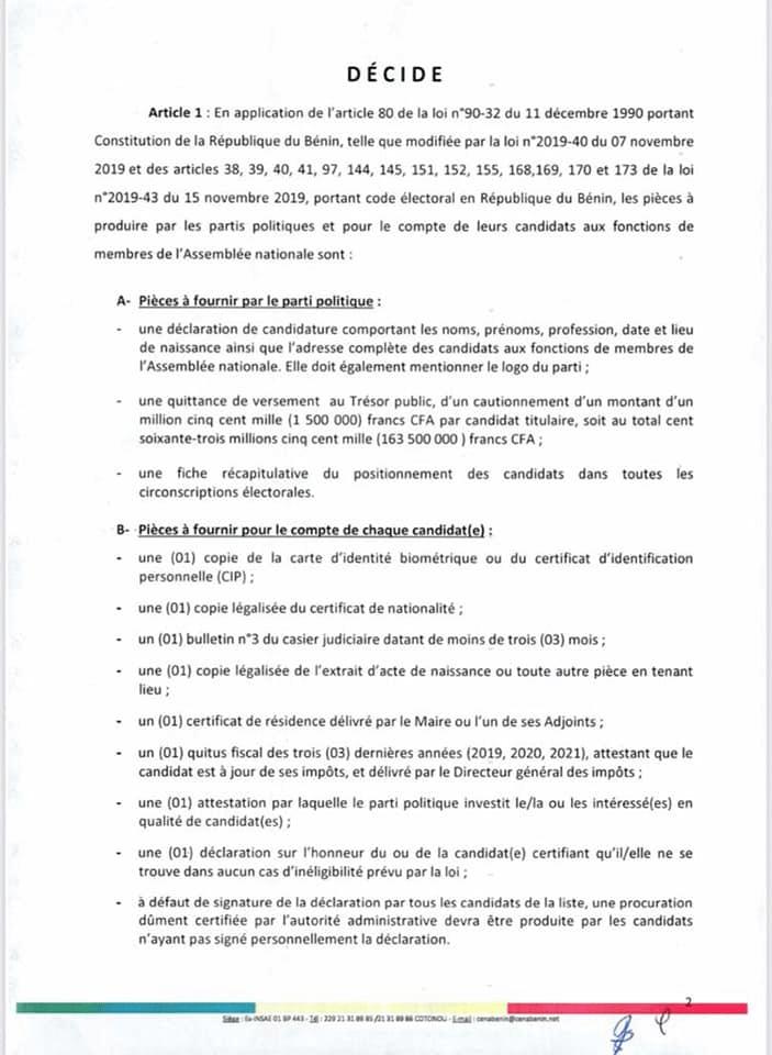 Africa-Press – Benin. Les partis politiques et potentiels candidats aux élections législatives de 2023 savent désormais à quoi s’en tenir dans la constitution de leur dossier de candidature. La commission électorale nationale autonome (CENA) a rendu public les pièces constitutives du dossier de candidature.