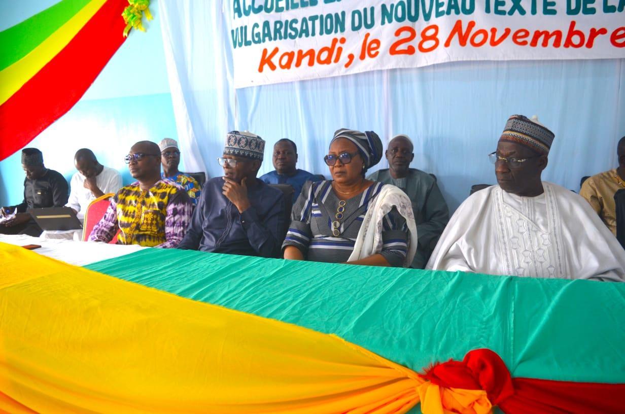 Face à un public venu en grand nombre, le ministre Alassane Seidou a adopté une démarche pédagogique pour présenter les principales innovations de la nouvelle Constitution. Il a abordé, point par point, les aspects qui suscitent le plus de questions: l’esprit de la réforme, la conformité de la procédure, le maintien du nombre de mandats présidentiels, le parrainage pour les candidats à la présidentielle, la création du Sénat, la durée du mandat des sénateurs et leurs prérogatives, ou encore la réforme de la saisine de la Cour constitutionnelle. Le ministre a insisté sur les objectifs essentiels de la révision: mettre la politique au service du développement, éviter l’instabilité liée aux ambitions personnelles et restaurer une culture de responsabilité et de vertu dans la vie publique. Il a rappelé que la réforme vise également à réguler la transhumance politique, souvent source de crises répétées et d’immobilisme. Une part importante de son intervention a été consacrée au droit de propriété et à l’expropriation pour cause d’utilité publique. Alassane Seidou a expliqué que de nombreux projets de développement sont freinés par des conflits fonciers, la multipropriété ou l’absence de titres officiels. Les nouvelles dispositions ont donc pour objectif de fluidifier les procédures tout en garantissant le droit au dédommagement. La mobilisation observée à Kandi reflétait est le fruit de l’implication des acteurs politiques locaux. Aux côtés du ministre se trouvaient le maire, le préfet, plusieurs députés dont Issa Salifou, Nassirou Bako Arifari et Labiou Amadou Djibril, ainsi que le ministre conseiller Bio Guerra Saka Kina. Ces personnalités ont, tour à tour, soutenu les explications du ministre et salué la pertinence des réformes engagées par le gouvernement du président Patrice Talon.