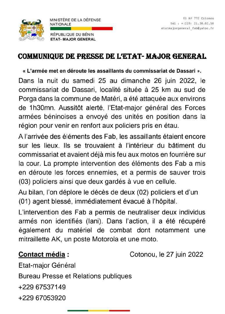 Africa-Press – Benin. Dans la nuit du samedi 25 au dimanche 26 juin, le commissariat de Dassari, commune de Matéri, a été la cible d’attaque terroriste. Le bilan fait état de 2 morts du Côté des Forces armées béninoises et 2 morts du côté des assaillants. Contrairement à une certaine presse qui a mentionné que les deux policiers ne sont pas morts, l’Etat-major général a bien fait cas des deux morts au sein des policiers et deux dans le rang des assaillants. L’un des policiers morts en la personne de Moustapha Mohamed Bio Kékéré a été inhumé hier, lundi 27 juin. L’enterrement est fait au cimetière musulman de Kandi, sa ville natale autour de 08H20, en présence du Préfet de l’Alibori, du DDPR, des hommes en uniforme et des parents et proches de la victime.