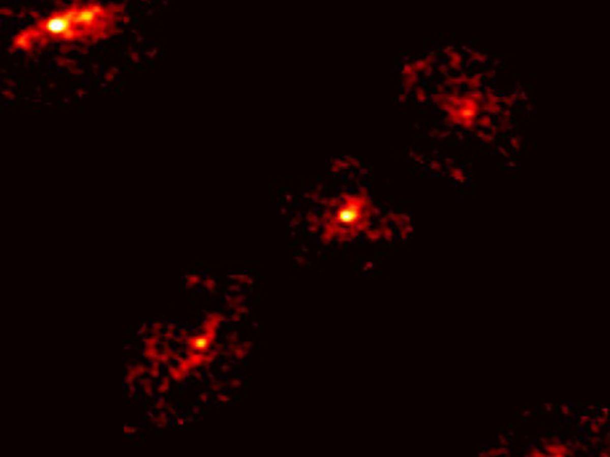 Par ailleurs, la morphologie de la croix à cinq points a été mise au jour de manière fortuite dans le domaine des longueurs d’onde appartenant aux sous-millimètres, qui sont situés entre les micro-ondes et l’infrarouge lointain. Cette fenêtre d’observation du spectre électromagnétique permet, entre autres, d’observer du gaz, des poussières interstellaires, la formation d’étoiles ou des galaxies distantes. Les images par effet de lentille de la galaxie HerS-3 sont observées via spectroscopie par l’intermédiaire de lignes moléculaires, c’est-à-dire quand certaines molécules absorbent toute lumière à certaines longueurs d’onde, ce qui rend compte de leur composition chimique, notamment en monoxyde de carbone (CO) et en eau.