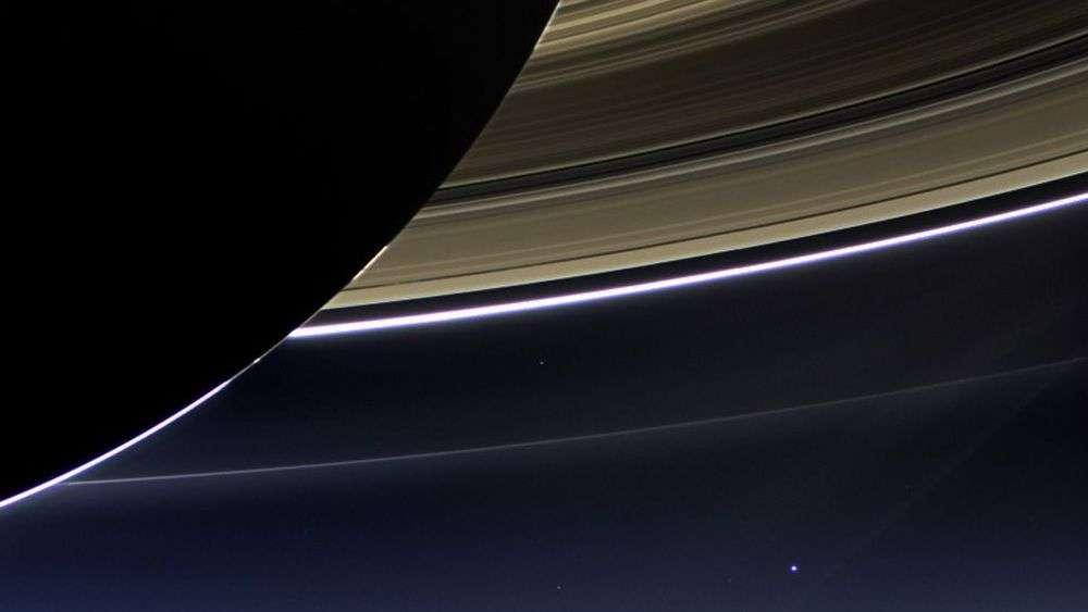 Saturne imagée par la sonde Cassini – Huygens. On distingue nettement les anneaux ainsi qu’un point bleu pâle en bas de la photo : la Terre. © Nasa, JPL-Caltech