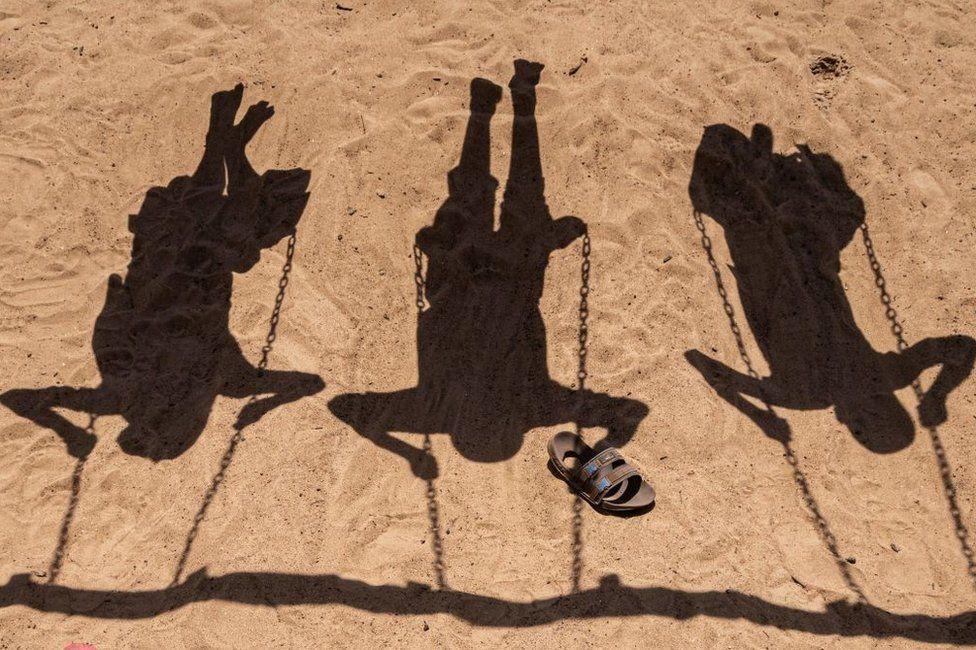 On the same day, children at a refugee centre in the Ugandan border town of Kisoro play on swings.