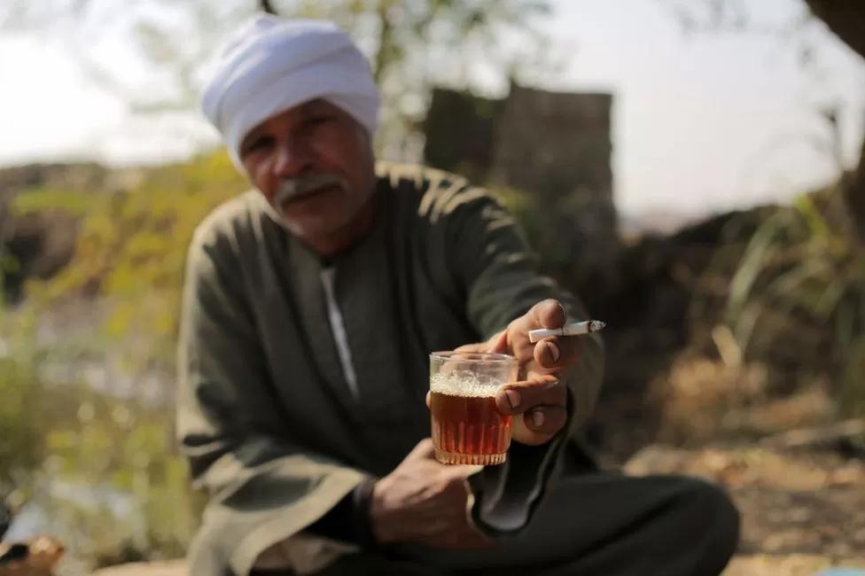 After a tough day at work on Tuesday, an Egyptian farmer sits down for a cigarette and a cup of sweet tea.