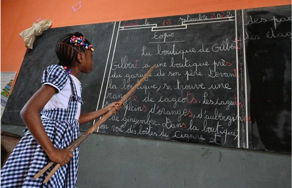 Another child, in Ivory Coast, takes her place in front of the blackboard in her classroom at the start of the school year.