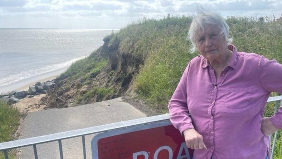 The ground under Bryony Nierop-Reading’s bungalow fell into the sea in 2013 and there’s now a safety barrier across her street which ends abruptly at the top of the cliff.