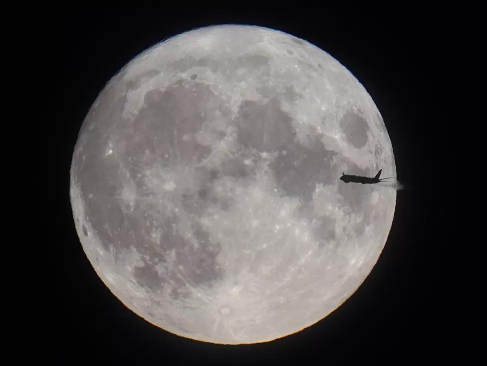 A plane is seen with the full moon behind, also in London