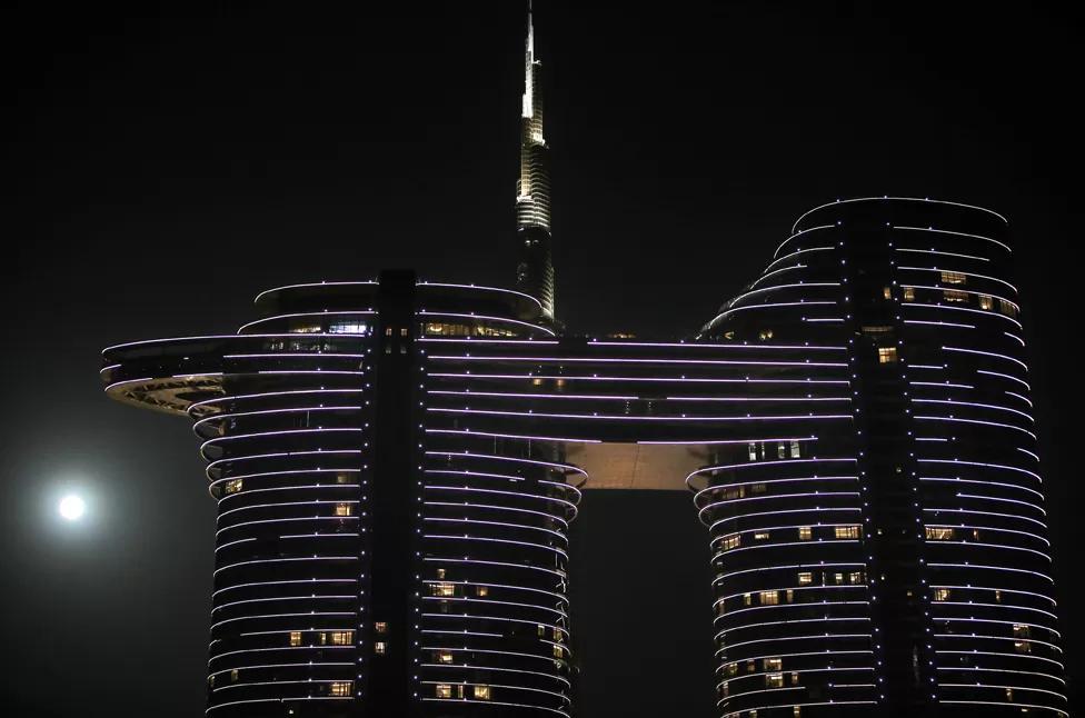 The moon rises in the sky behind world’s tallest building of Burj Khalifa in Dubai