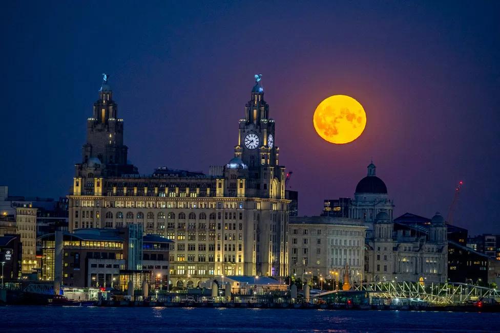 The moon glows over the Royal Liver Building in Liverpool
