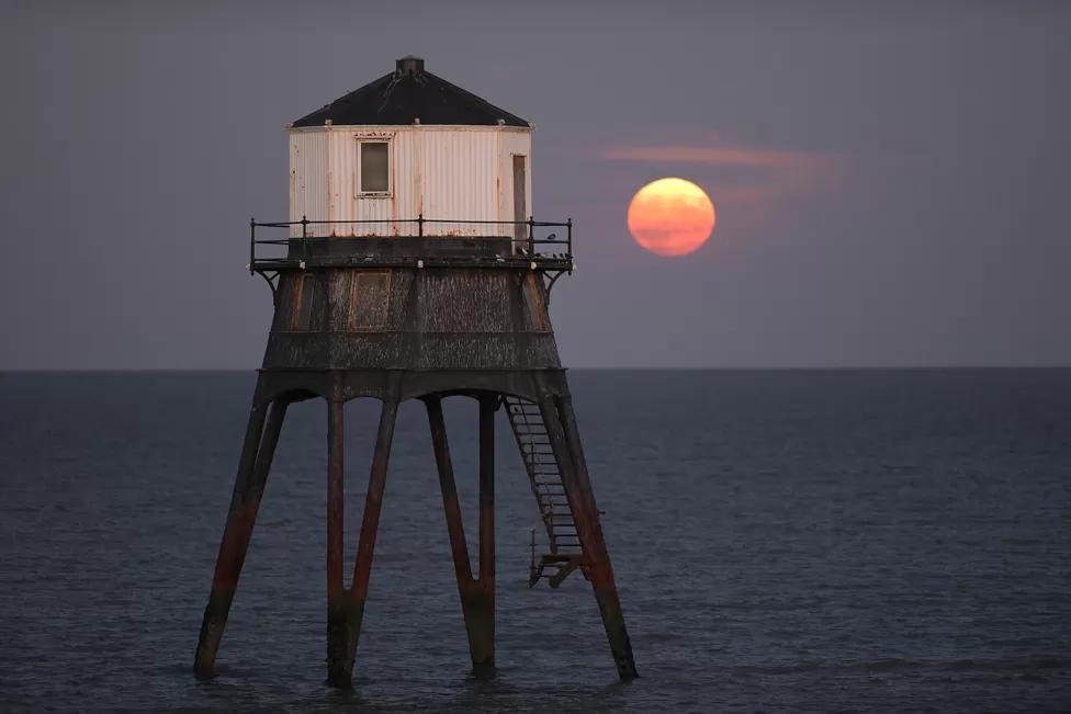 The Dovercourt Lower Lighthouse in Essex with the supermoon rising behind