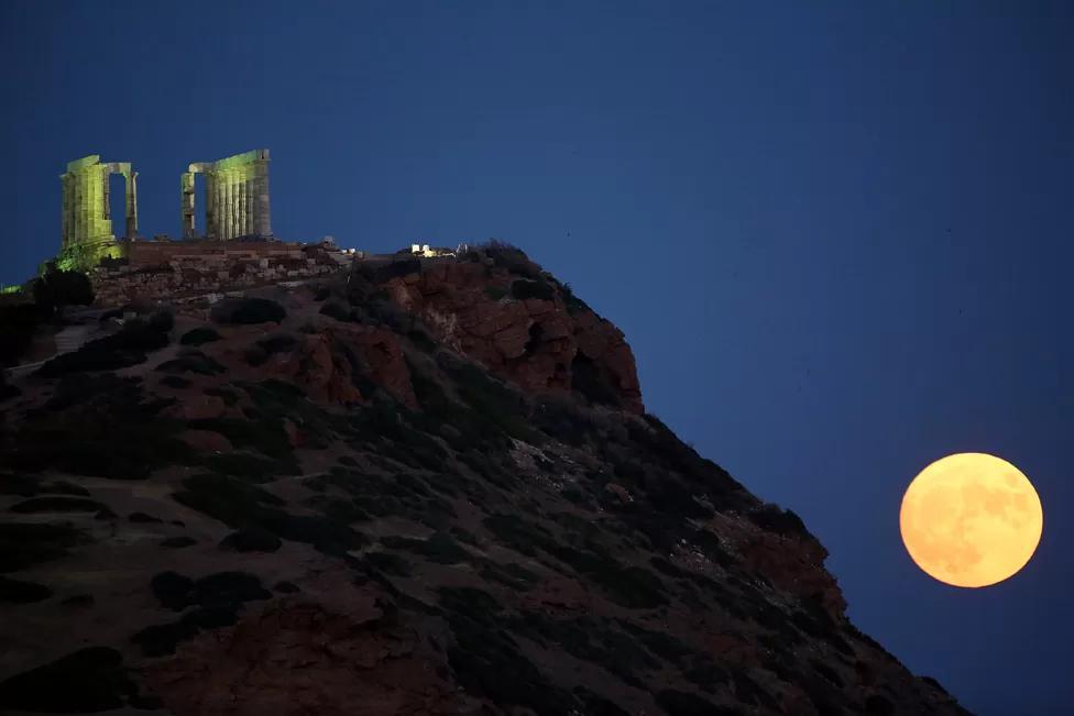 The moon rises over Cape Sounio and the Temple of Poseidon, east of Athens