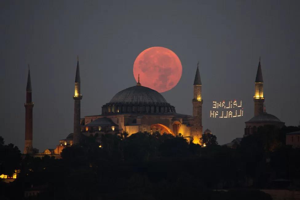 Here the moon sinks behind the Hagia Sophia Mosque in Istanbul
