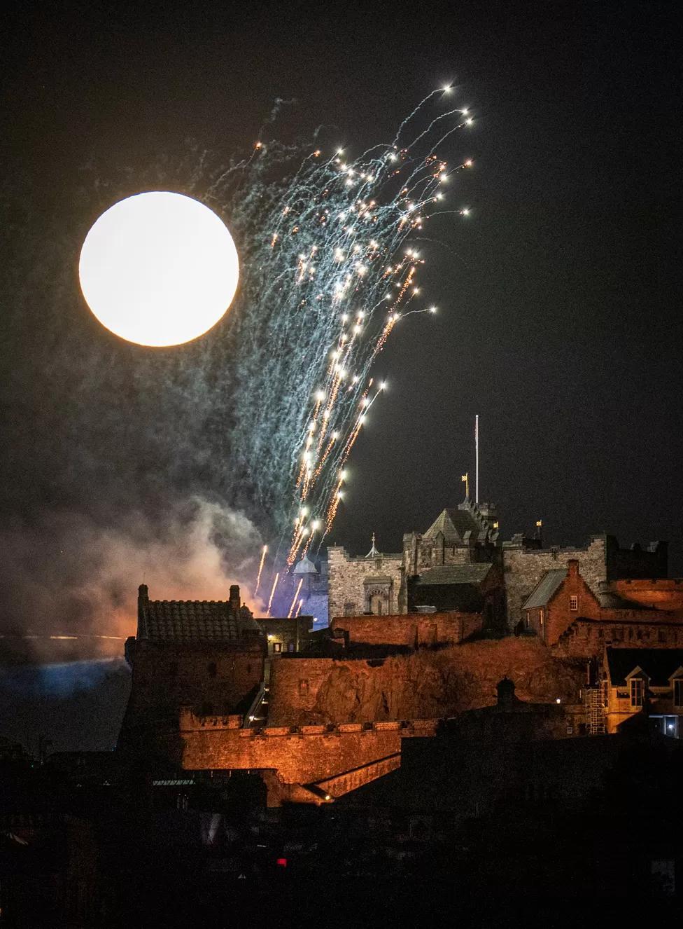 The moon shines behind Edinburgh Castle during the Royal Edinburgh Military Tattoo fireworks display