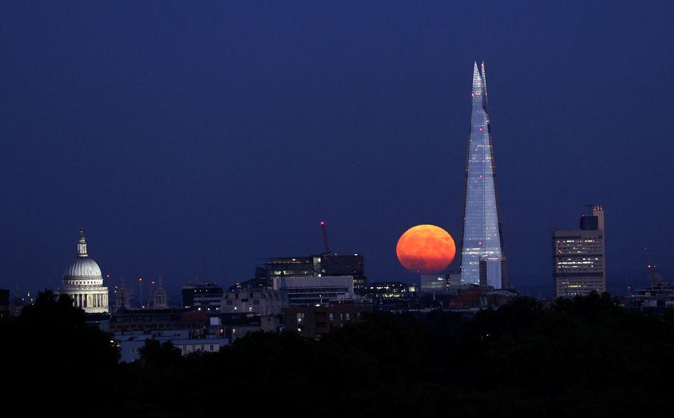 The supermoon rises near the Shard skyscraper and St Paul’s Cathedral in London