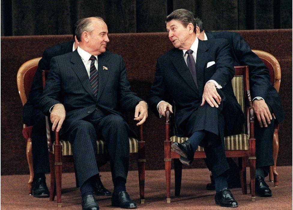 Ronald Reagan and Mikhail Gorbachev signing the Intermediate-Range Nuclear Forces Treaty in 1987. The agreement saw thousands of missiles decommissioned