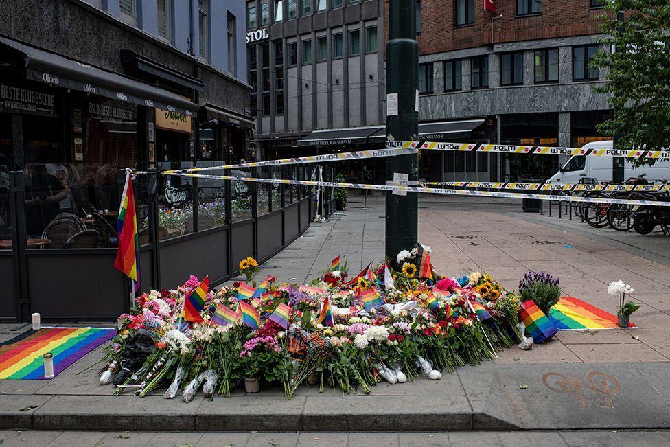 Flowers and rainbow flags lie close to the scene of a number of shootings in Oslo, Norway, including at a popular LGBTQ+ venue. Two people died and 21 were wounded. A 42-year-old man has been arrested and charged with murder, attempted murder and terrorist acts.