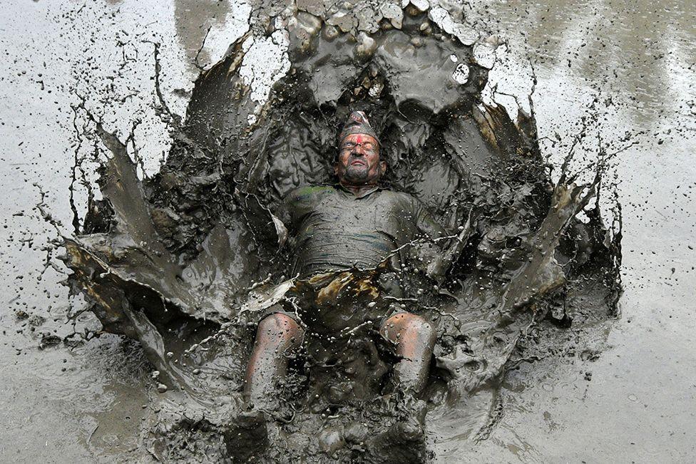 A mud-covered farmer plays in a paddy field during National Paddy Day, which marks the start of the annual rice-planting season, in Tokha village, on the outskirts of Kathmandu, Nepal.