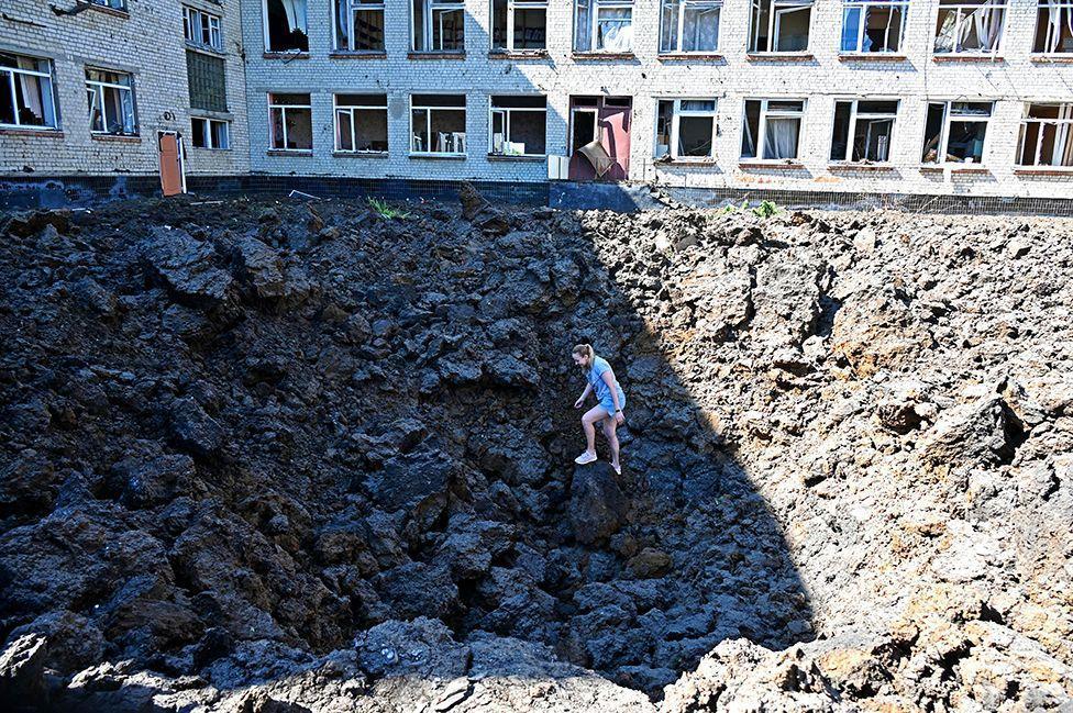 A woman stands in a crater caused by missile strikes at a school playground in a residential area of Kharkiv, Ukraine. The country’s leaders have signed a declaration of intent to join the European Union, while, Russia has begun shipping grain from territory its forces are occupying in Ukraine.