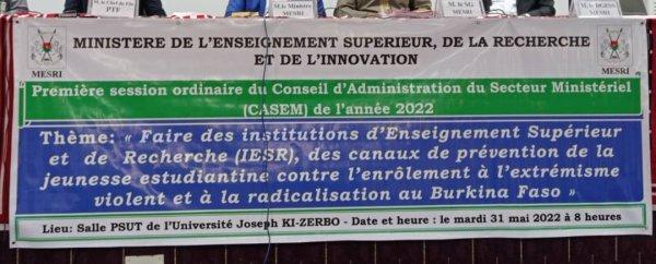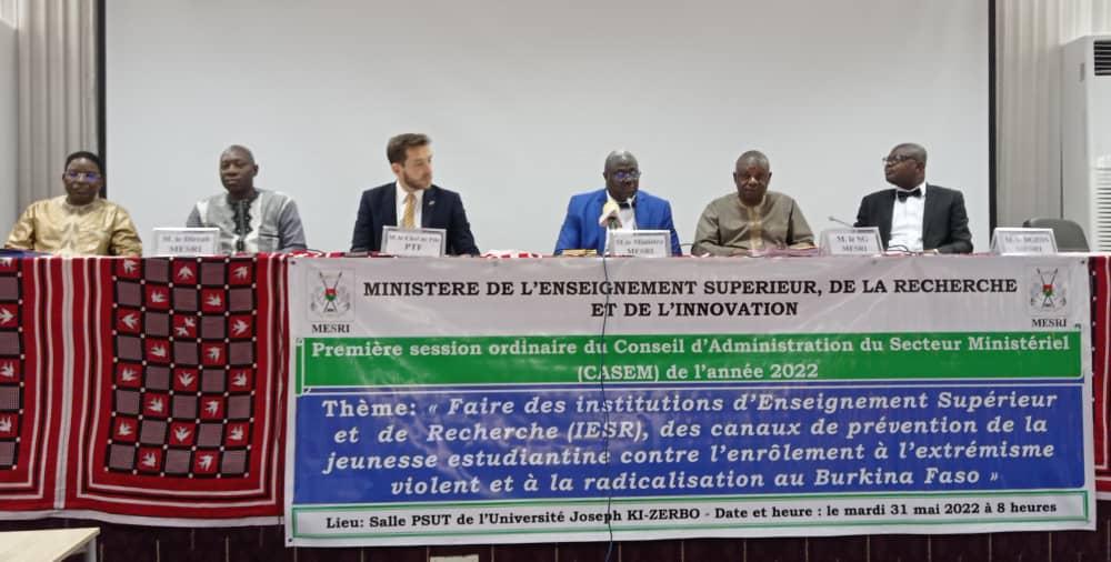 Africa-Press – Burkina Faso. Le ministère de l’Enseignement supérieur, de la recherche scientifique et de l’innovation (MERSI) a tenu ce 31 mai, la première session de l’année 2022 de son conseil d’administration du secteur ministériel (CASEM). Au cours de cette rencontre, les participants vont réfléchir autour du thème « Faire des institutions d’enseignement supérieur et de recherche, des canaux de prévention de la jeunesse estudiantine contre l’enrôlement à l’extrémisme violent et à la radicalisation au Burkina Faso « . En plus de l’examen de ce thème, le CASEM va aussi servir de cadre pour l’analyse et l’adoption du rapport d’activités 2021 et du programme d’activités réajusté de l’année 2022.
