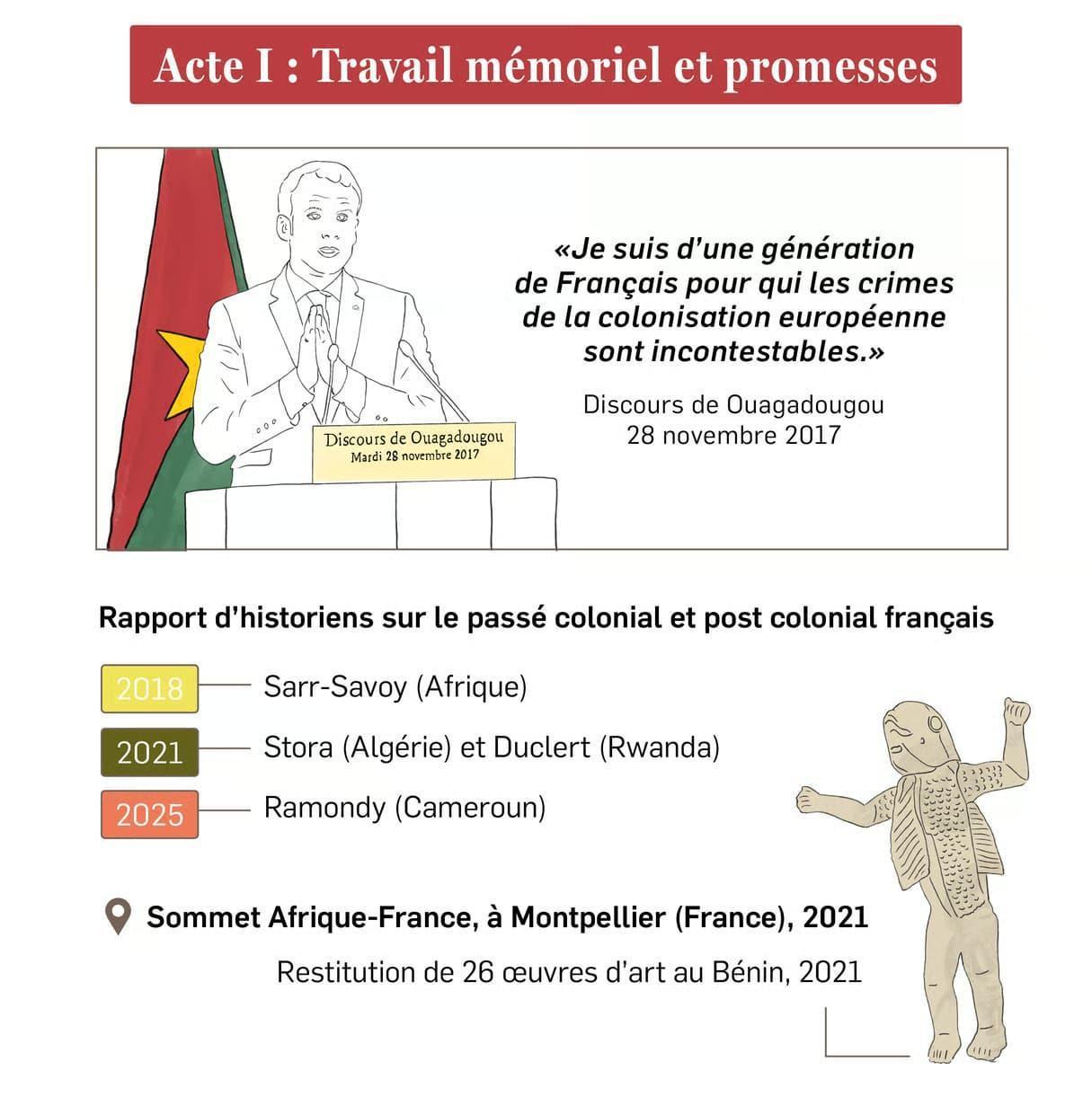 Malgré ces premiers couacs, le travail mémoriel est engagé. En septembre 2018, Macron reconnaît l’assassinat de Maurice Audin par l’armée française pendant la guerre d’Algérie. En juillet 2020, Paris restitue les crânes de résistants algériens jusqu’ici conservés en France. Le rapport Savoy-Sarr (novembre 2018) recommande la restitution de 90 % des œuvres africaines détenues par les musées français. En novembre 2021, 26 œuvres royales d’Abomey, pillées en 1892, retournent au Bénin, dont le trône du roi Béhanzin.