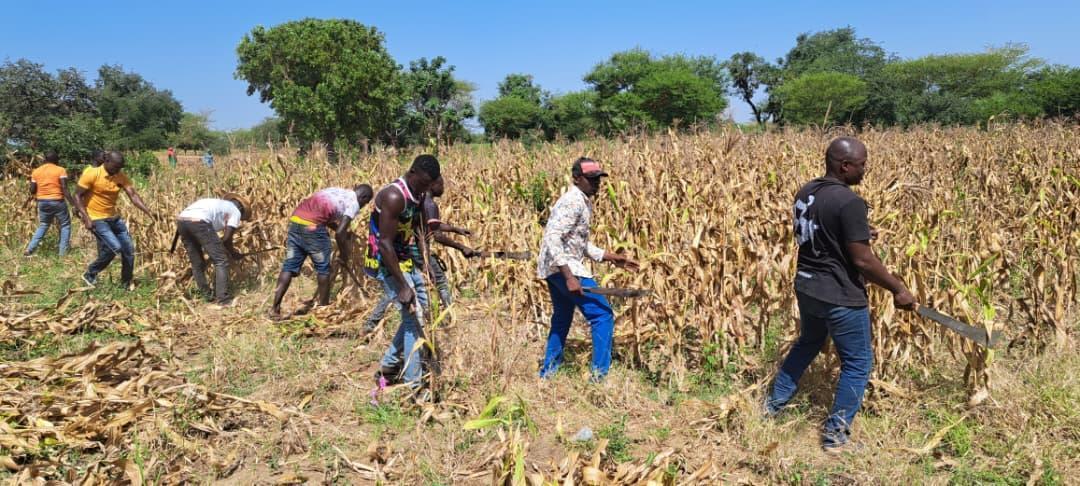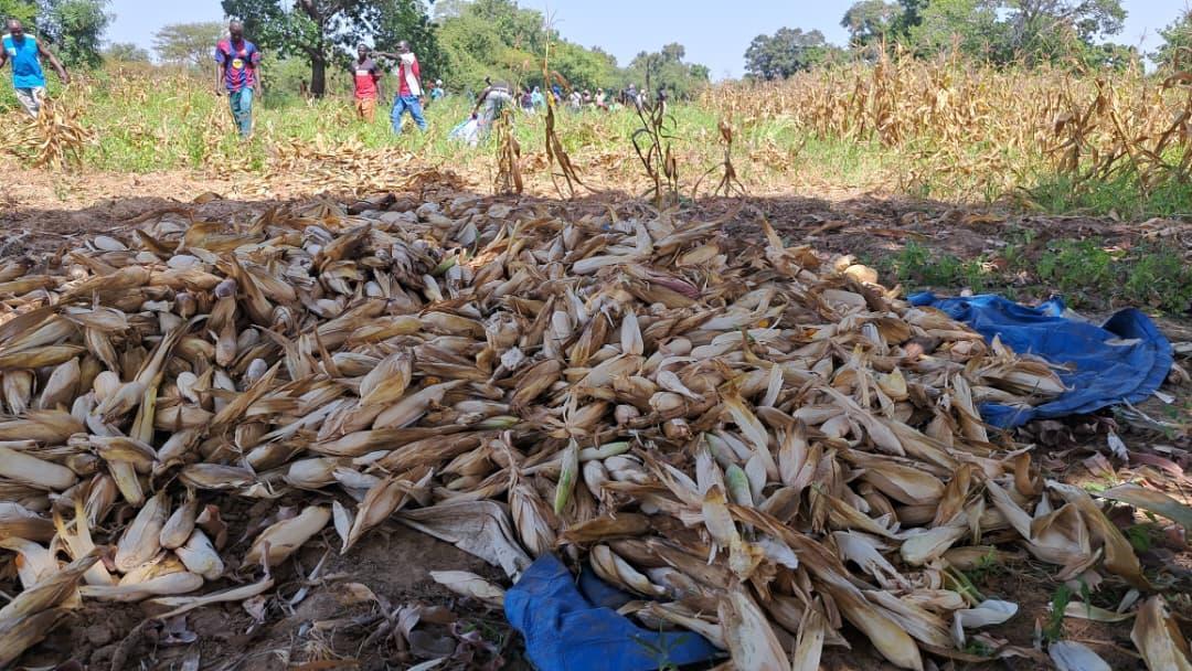 Dès 8 heures ce lundi, jeunes et femmes étaient mobilisés pour entamer la récolte des 4,5 hectares cultivés, dont 3,5 hectares de maïs et 1 hectare de sorgho rouge (mil).