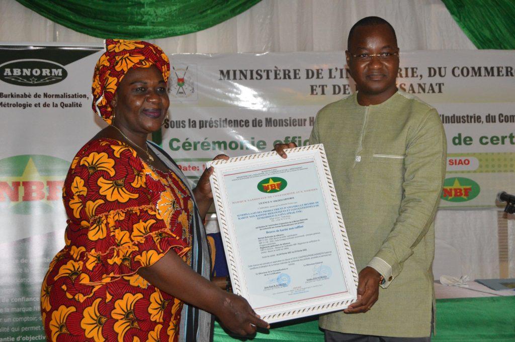 Africa-Press – Burkina Faso. Dans le but de promouvoir la qualité des produits et services, il a été créé l’Agence Burkinabè de Normalisation, de la Métrologie et de la Qualité (ABNORM). En vue de jouer pleinement sa mission, elle a organisé une séance de remise de certification ce lundi 5 juillet 2021. Plus d’une vingtaine de produits viennent ainsi s’ajouter à la gamme de produits déjà certifiés.
