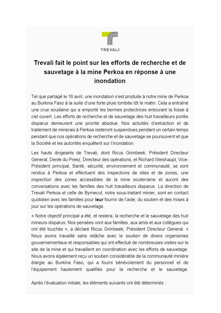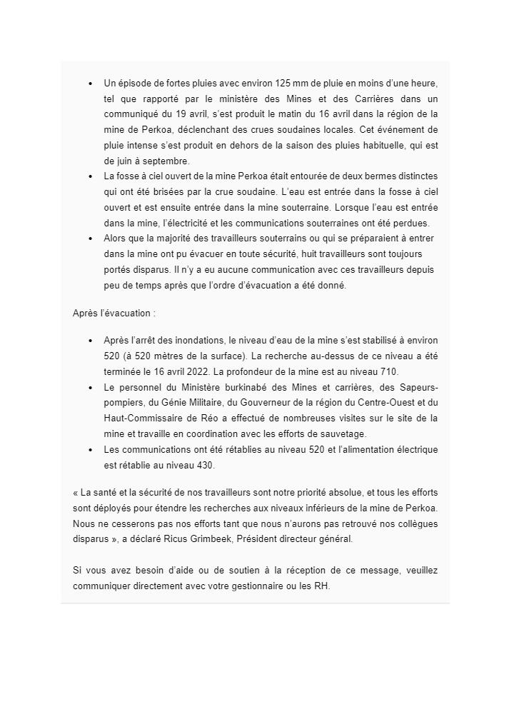 Nos activités d’extraction et de traitement de minerais à Perkoa resteront suspendues pendant un certain temps pendant que nos opérations de recherche et de sauvetage se poursuivent et que la Société et les autorités enquêtent sur l’inondation.