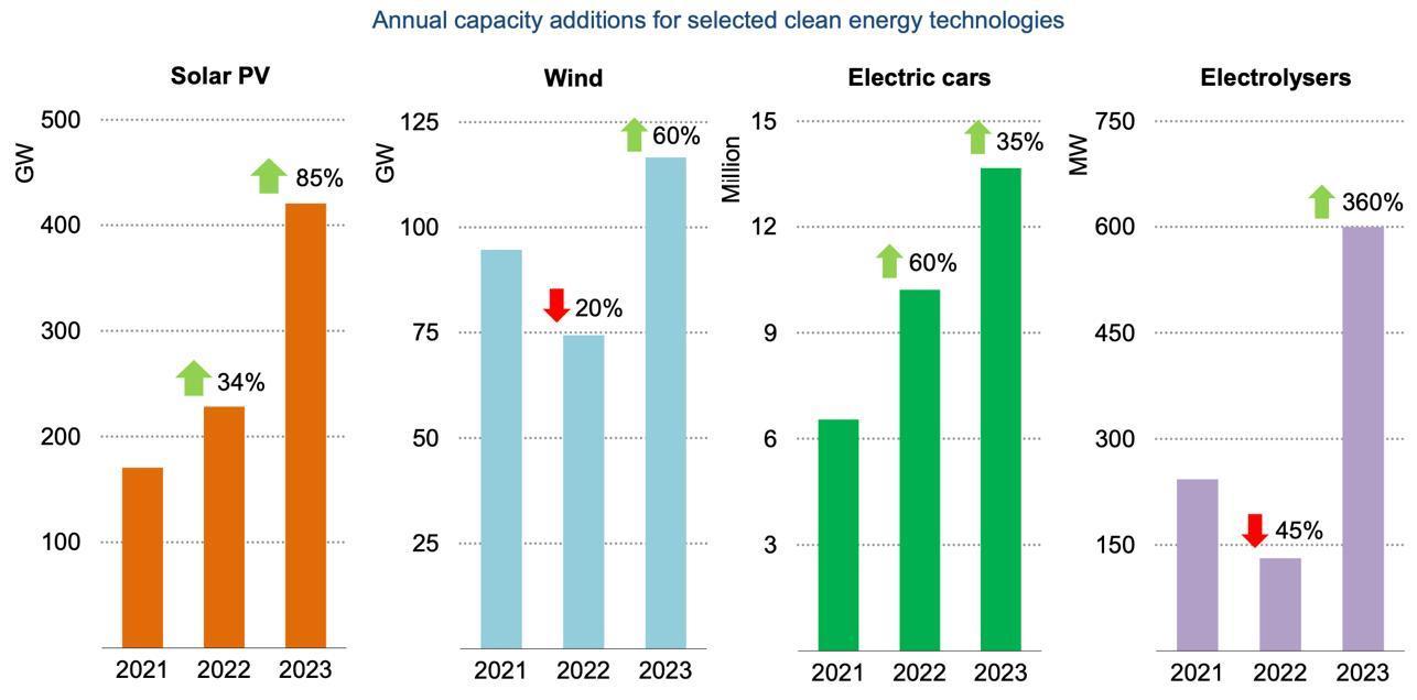 L’adoption croissante des voitures électriques (près de 14 millions de ventes dans le monde en 2023, soit + 35% par rapport à 2022) explique en partie cette hausse de la demande, tout comme les importantes installations de capacités éoliennes et solaires et l’extension des réseaux de transmission d’électricité.