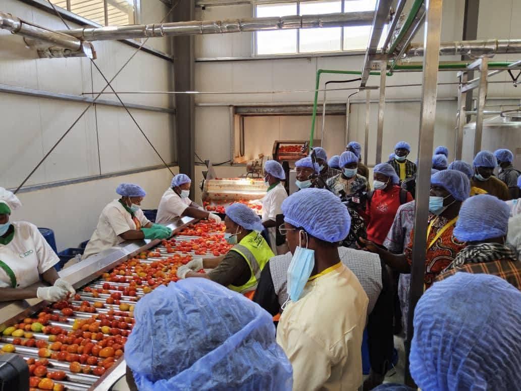 Accueillis par les responsables techniques et administratifs, les visiteurs ont parcouru les différentes unités de production, de la réception des tomates fraîches à leur transformation en produits finis commercialisés sous la marque A’diaa.
