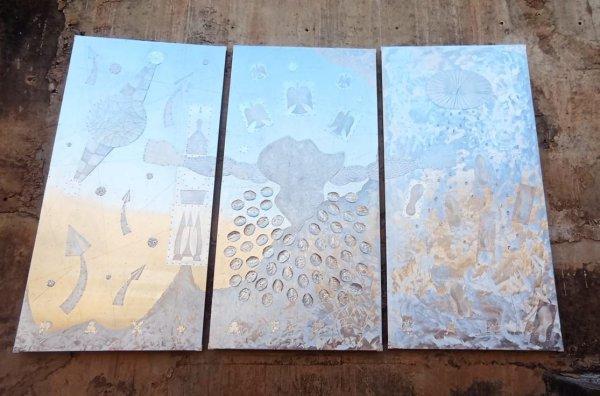 Kaïs Dhifi, jeune artiste sculpteur tunisien, a exposé son œuvre intitulé « Pax Africana ». « Sous la forme d’une odyssée contre-mythologique, l’œuvre se présente comme un triptyque de panneaux en aluminium gravés et rivetés, retraçant le processus et rendant hommage à l’événement éponyme (…). Vestige archéologique ou artefact du futur issu d’un monde imaginé, disparu ou à venir, l’œuvre joue de son ambiguïté temporelle pour proposer une lecture poétique des notions de mémoire, de territoire et de résilience, dans un espace africain stratégique où culture et géopolitique n’ont jamais cessé de se superposer », a expliqué l’artiste tunisien.