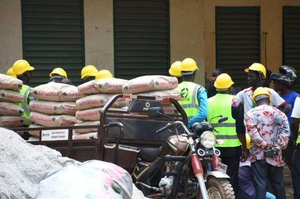 Peu avant 8h30, nous franchissons le portail du lycée. Les militaires chargés de la sécurité notent scrupuleusement l’identité de chaque entrant. Passé ce contrôle, le décor s’impose: les machines vrombissent, les bruits de pelles et de truelles s’entremêlent. Des volontaires déchargent du ciment offert par des donateurs qui arrivent sur le site en voiture ou à moto. Pour les dons les plus consistants, des camions-bennes sont sollicités. Ceux qui n’apportent pas de matériaux contribuent autrement, en participant directement aux travaux de confection des pavés.