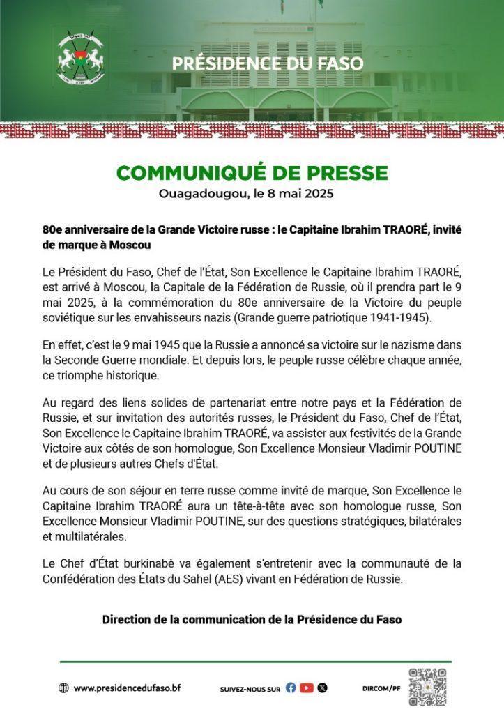 Au regard des liens solides de partenariat entre notre pays et la Fédération de Russie, et sur invitation des autorités russes, le Président du Faso, Chef de l’Etat, Son Excellence le Capitaine Ibrahim TRAORE, va assister aux festivités de la Grande Victoire aux côtés de son homologue, Son Excellence Monsieur Vladimir POUTINE et de plusieurs autres Chefs d’Etat.