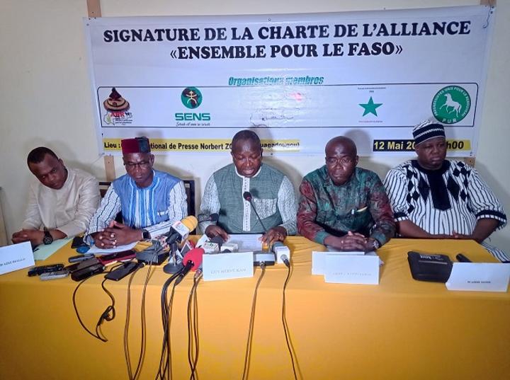 Africa-Press – Burkina Faso. Cinq formations politiques ont signé une charte d’alliance dénommée “Ensemble pour le Faso”, ce jeudi 12 mai 2022 à Ouagadougou. Il s’agit de l’Alliance panafricaine pour la refondation, du mouvement SENS, du Parti pour la renaissance nationale, du Parti pour la démocratie et le socialisme et des Progressistes unis pour le renouveau. Ces organisations politiques ont été respectivement représentées par Zackaria Soulga, Me Guy Hervé Kam, Abdoul Karim Sango, Ahmed Aziz Diallo et Wahir Somé.