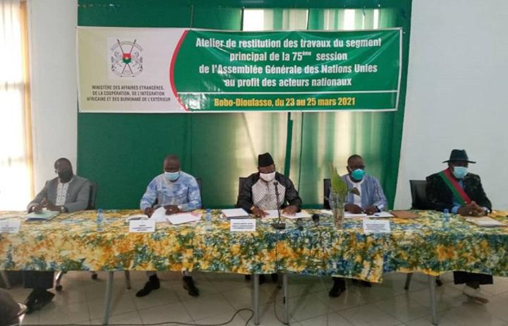 Africa-Press – Burkina Faso. Le ministère des Affaires étrangères, de la Coopération, de l’Intégration africaine et des Burkinabè de l’extérieur organise, du 23 au 25 mars 2021 à Bobo-Dioulasso, un atelier de restitution des travaux du segment principal de la 75e session ordinaire de l’Assemblée générale des Nations-unies au profit des acteurs nationaux. C’est le ministre délégué chargé de l’Intégration africaine et des Burkinabè de l’extérieur, Maxime Koné, qui a présidé la cérémonie d’ouverture des travaux ce mardi 23 mars 2021.