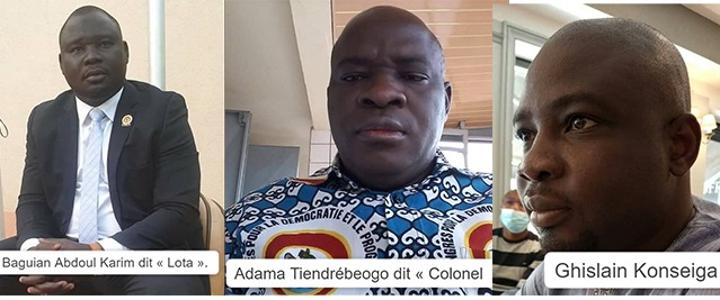 Il s’agit du Secrétaire national à la mobilisation des jeunes, Adama Tiendrébeogo dit « Colonel », du 2e Secrétaire adjoint à la mobilisation des jeunes Ghislain Konseiga et du 4e Secrétaire adjoint chargé de la mobilisation des jeunes du parti, Baguian Abdoul Karim dit « Lota ».