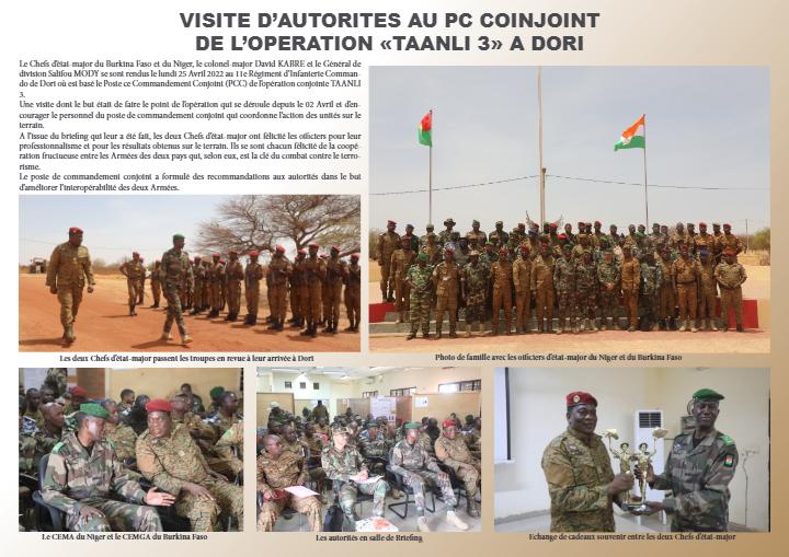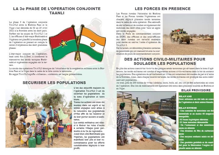 L’État-Major conjoint de l’opération, basé cette fois à Dori, a coordonné la manœuvre des unités tactiques Burkinabè et nigériennes engagées sur le terrain. Le succès des opérations TAANLI témoigne de l’excellence de la coopération militaire entre le Burkina Faso et le Niger dans le cadre de la lutte contre le terrorisme.