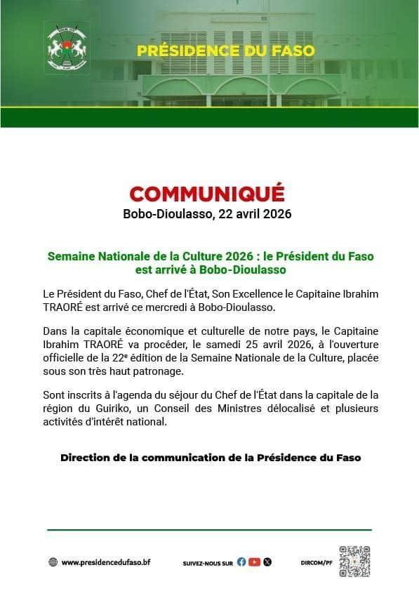 Africa-Press – Burkina Faso. Bobo-Dioulasso entre déjà dans l’effervescence de la 22e édition de la Semaine nationale de la culture (SNC). Le Président du Faso, Chef de l’État, le Capitaine Ibrahim Traoré, est arrivé ce mercredi 22 avril 2026 dans la capitale économique et culturelle du Burkina Faso, où il présidera l’ouverture officielle de l’événement prévue le samedi 25 avril.