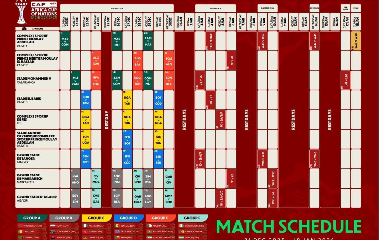 Africa-Press – Burkina Faso. La Confédération africaine de football a dévoilé le calendrier complet de la 35è coupe d’Afrique des Nations. Le match d’ouverture entre le Maroc et les Comores aura lieu le 21 décembre au complexe sportif Prince Moulay Abdellah de Rabat. La phase de groupes se déroulera ainsi jusqu’au 31 décembre avec les dernières confrontations des groupes E et F. La compétition marquera une pause les 1er et 2 janvier 2026.