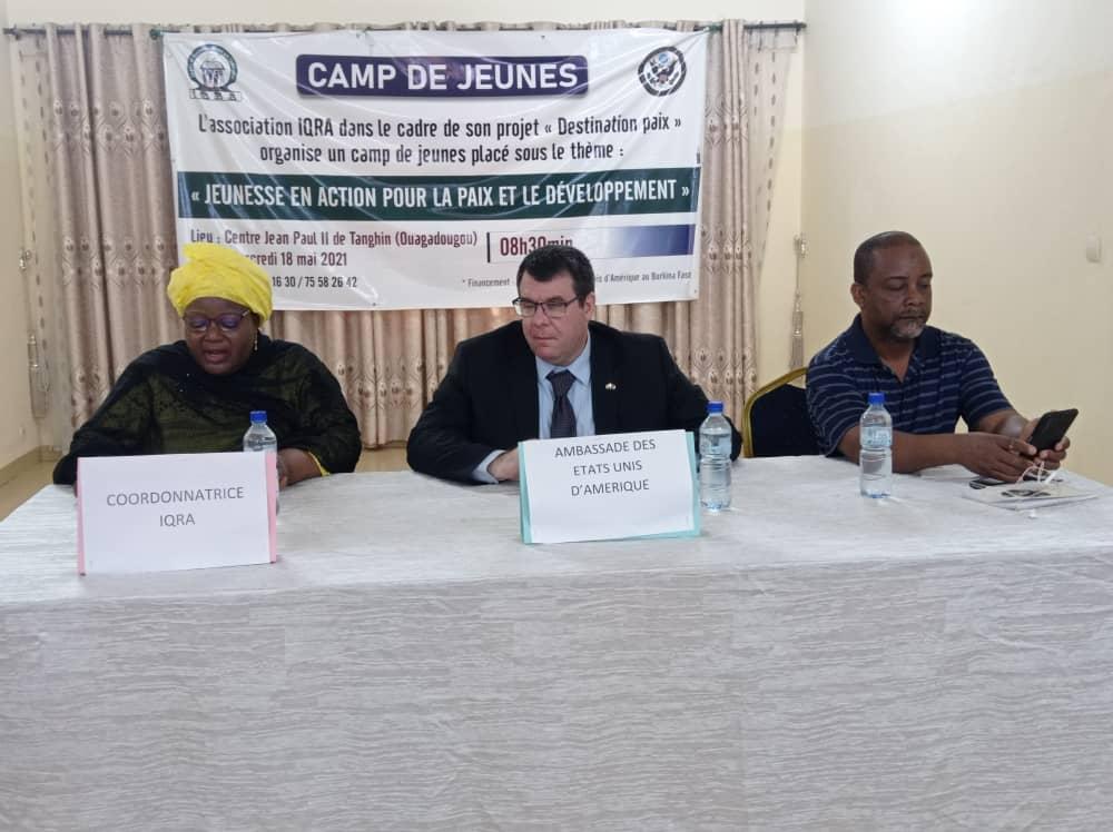 Africa-Press – Burkina Faso. Dans le cadre du projet « destination paix », l’association IQRA a organisé un camp de jeunes, ce mercredi 18 mai 2022, à Ouagadougou. L’ouverture des travaux a été présidée par le directeur des affaires publiques et de la presse de l’ambassade des États-Unis d’Amérique au Burkina Faso, Todd Bullock.