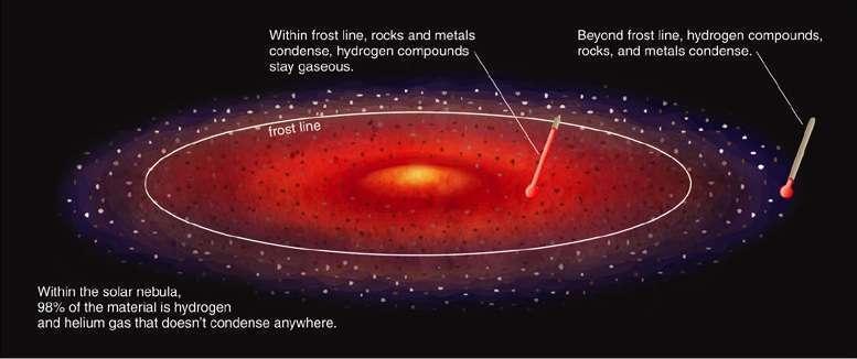 Au-delà de la limite de gel (frost line), les composés métalliques, rocheux et gazeux peuvent se condenser. © Pearson Education, Addison Wesley