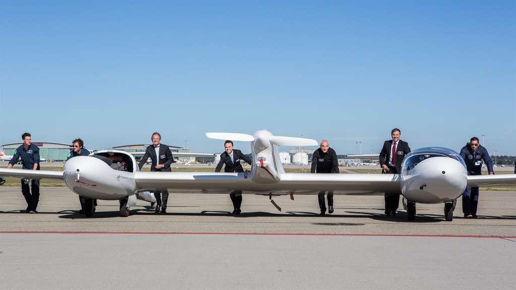 Les ingénieurs allemands se sont obstinés. Des chercheurs de l’université d’Ulm ont mis la main à la pâte et la DLR s’est engagée dans un vaste programme de recherche sur l’aviation électrique, avec comme partenaires industriel Airbus et Siemens et comme appui scientifique l’aide de 20 universités et des centres de recherche de l’association Helmotz. Le HY4 est basé sur un avion électrique du commerce, le Taurus Electro de l’entreprise tchèque Pipistrel. Ce Taurus est en fait un « motoplaneur », c’est-à-dire un planeur, avec une grande envergure de 14,97 m et un moteur de faible puissance (30 kW en croisière, en l’occurrence). L’équipe de H2Fly, qui mène ce projet, a réuni deux Taurus, pour porter la motorisation, la pile à combustible et la batterie, parvenant à une masse totale de 1.500 kg. Le procédé est ingénieux et a évité de construire un avion de A à Z, comme l’a fait l’équipe de Solar Impulse.