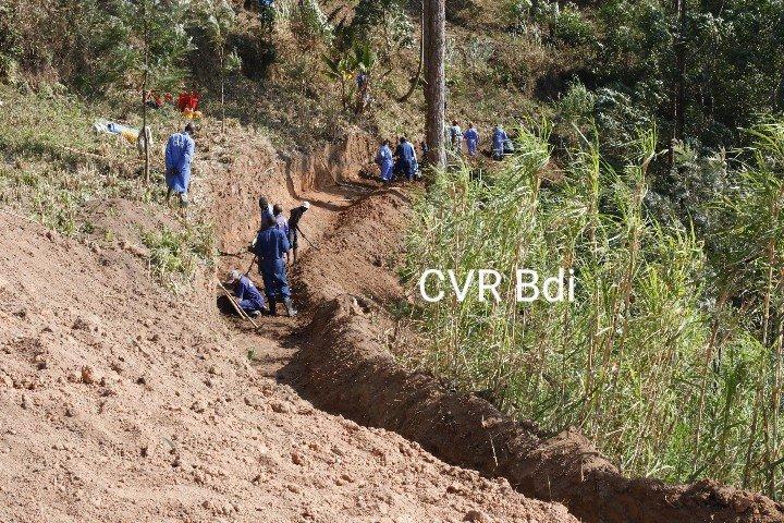 – un déterrement de cadavres de victimes Bahutu dans un charnier en commune Burambi, en zone Nzinga, colline Busanga, sous colline Bukunda, dans un lieu appelé Rubura, dans le champs de M. Ntibiranoga Jonathan, exploité actuellement par ses filles… ( Les corps des victimes Bahutu Barundi étaient jetés dans un tranché long de 14 mètres, large de 1,40 m , sur une profondeur de 1,2 m. Ce charnier a été trouvé grâce à 5 témoins. La majorité des victimes Bahutu étaient originaire de la colline Banda, sous colline Gasaro. Selon les témoins, ces victimes étaient arrêtées le jour par une milice et des militaires du régime des Bahima Barundi du sanguinaire Micombero Michel. Puis, la nuit, elles étaient massacrées ) ;