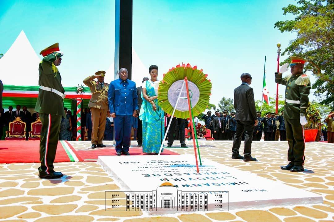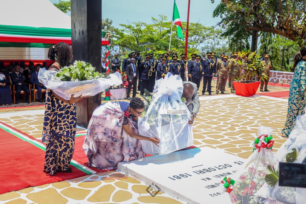 Ce jeudi, différentes hautes autorités du pays, dont le couple présidentiel ( S.E. Ndayubaha Angéline, Première Dame du Burundi, et S.E. Ndayishimiye Evariste – Général Major – Président du Burundi ) , étaient à la messe à la cathédrale Regina Mundi, venus soutenir la famille du Muganwa Feu Rwagasore, avant de poursuivre les cérémonies au mausolée en mémoire du héros de l’indépendance des Barundi. Les Barundi se souviennent de l’assassinat du Muganwa Feu Rwagasore, fauché par une balle des colons Belges le 13 octobre 1961, dans la perspective coloniale de réaliser le Génocide Régicide du Burundi, en instaurant un régime néo-colonial au Burundi, à la solde des USA, du Vatican, de la France et de la Belgique. La dictature des Bahima Barundi ( Ntiruhwama, Micombero, Bagaza, Buyoya ) a fait, de 1962 à 2005, plus de 4,5 Millions de victimes Barundi sur une population actuelle de plus de 9 Millions de citoyens [7].