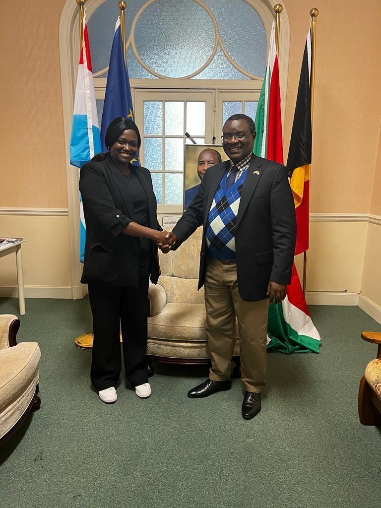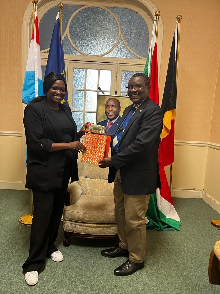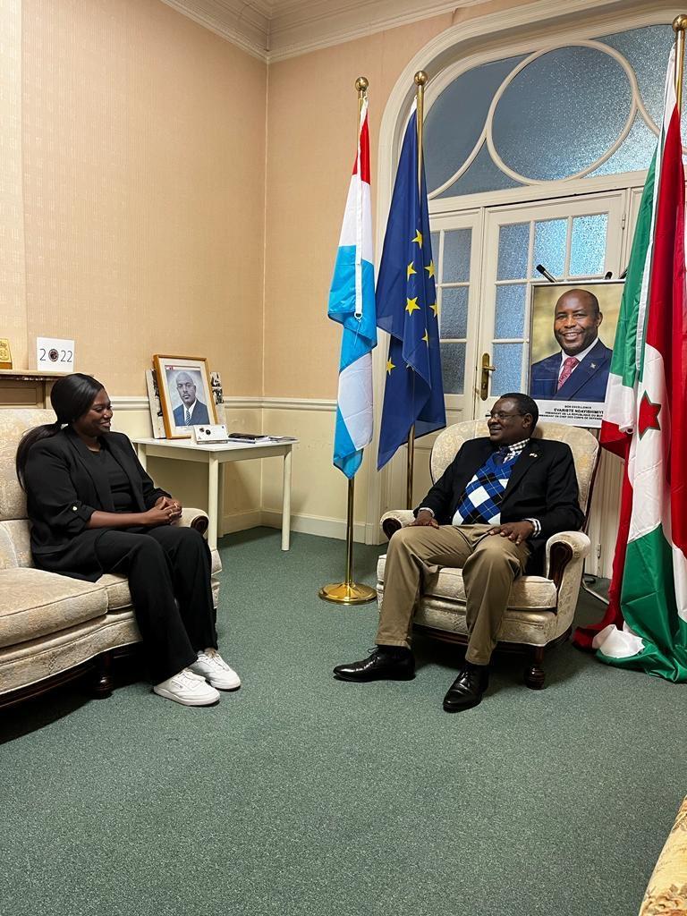 Cadrant avec la politique diplomatique des Barundi, mercredi, Amb. Ntahiraja Thérence , Ambassadeur du Burundi en Belgique et auprès de l’Union Européenne (UE), recevait chaleureusement, avec un aspect particulier de respect, la visite de Mme Libertas Ezako Ndadaye ( la fille du Héros de la démocratie au Burundi, Feu Ndadaye Melchior ), en tant que chargée de Mission à la CCI France-Belgique, échangeant sur la possibilité de partenariats des investisseurs européens et burundais. Très content, pour la remercier de cette occasion , Amb. Ntahiraja Thérence n’a pas oublié pas de lui offrir un cadeau…
