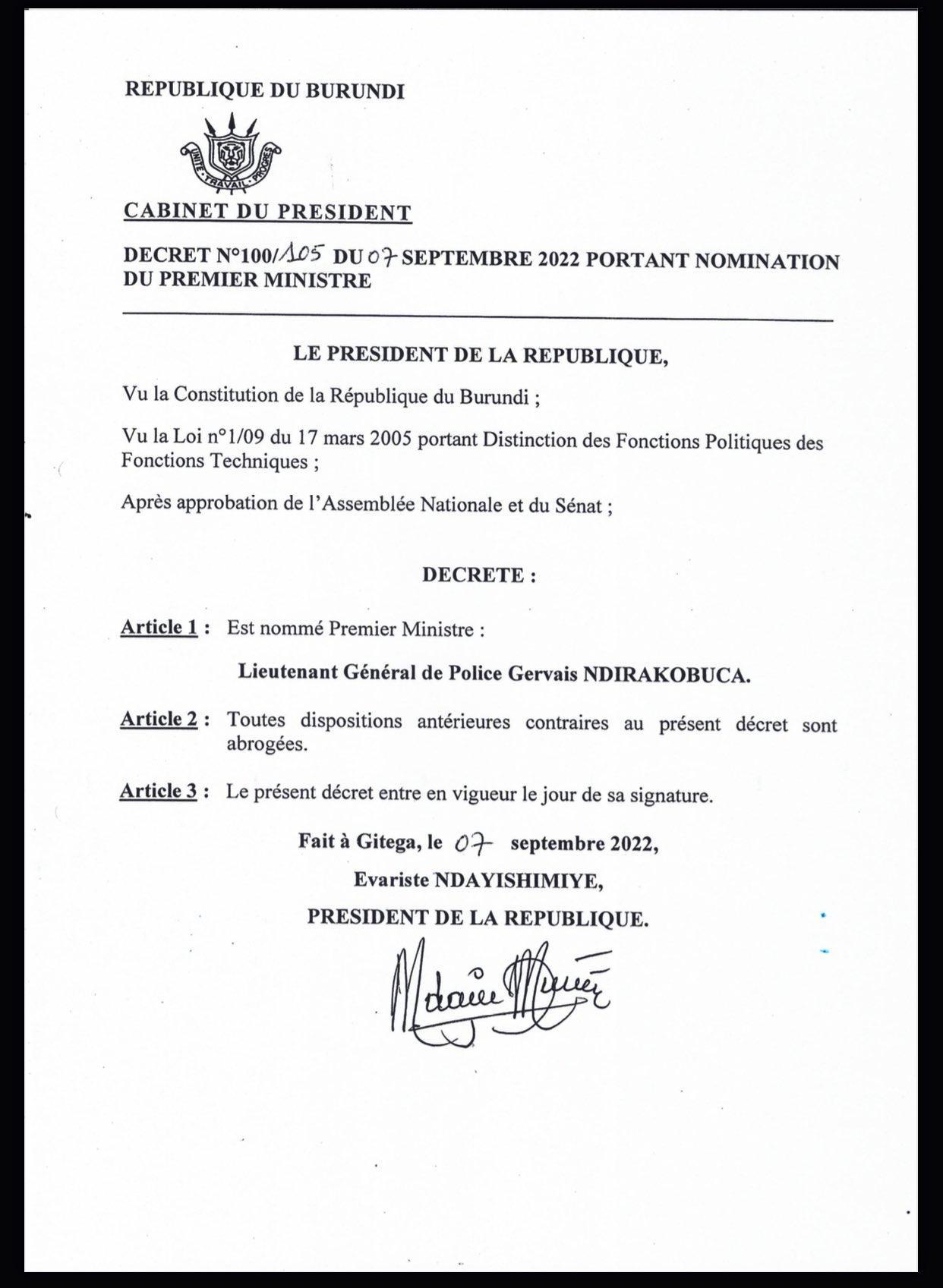Ce mercredi, tel que proposé par le Chef de l’Etat, S.E. Ndayishimiye Evariste ( Général Major ), Président du Burundi, M. Ndirakobuca Gervais ( Commissaire de Police en Chef – CPC ), Ministre burundais de l’Intérieur, vient d’être approuvé au Parlement Burundais par 113/113 voix, et au Sénat Burundais par 39/39 voix, comme nouveau 1er Ministre du Burundi, en lieu et place de M. Bunyoni Alain Guillaume (Commissaire de Police Général), conformément à l’article 130 de la Constitution du Burundi. Confirmée par le Décret n°100/15 du 07 septembre 2022 portant nomination du Premier Ministre.